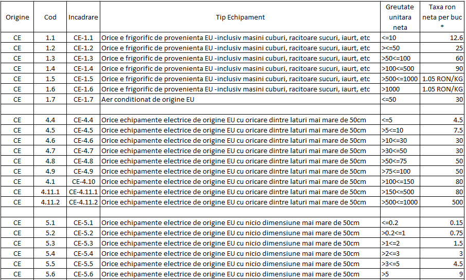 Pentru Produsele alimentate electric, in baza OUG 5/2015 privind deşeurile de echipamente electrice şi electronice (DEEE), publicată în Monitorul Oficial, Partea I, nr. 253 din 16.04.2015, Producatorii si distribuitorii sunt obligati sa informeze cumparatorii, in momentul vanzarii de EEE, cu privire la costurile colectarii, tratarii si eliminarii in conditii de protectie a mediului, prin evidentierea separata a acestor costuri.